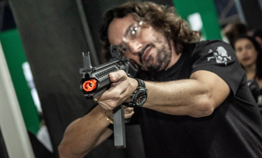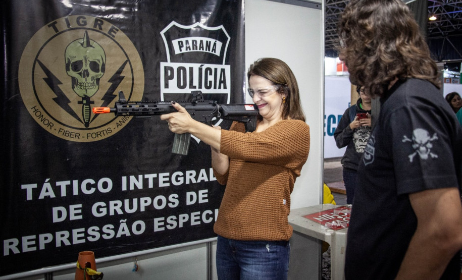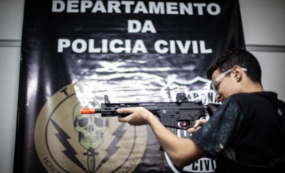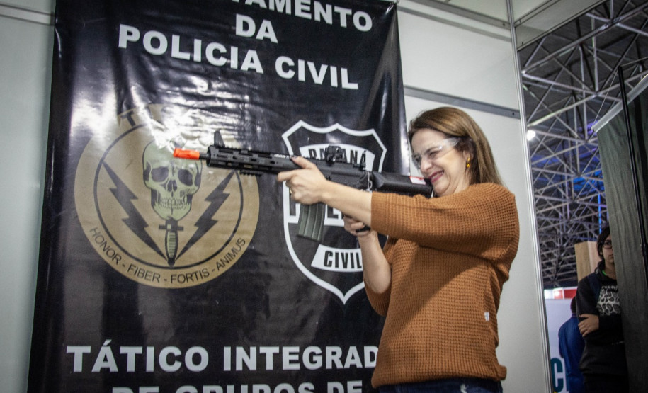 Estande da Polícia Civil do Paraná (PCPR) expõe equipamentos de operações especiais na Expoingá, em Maringá. São diversos tipos de armas, coletes e demais itens fundamentais para ações policiais de alto risco que ficam expostos até domingo (19) aos visitantes. A estrutura ainda oferece experiência de tiro com arma airsoft ao público em geral, o que tem lotado o estande desde o início do evento.