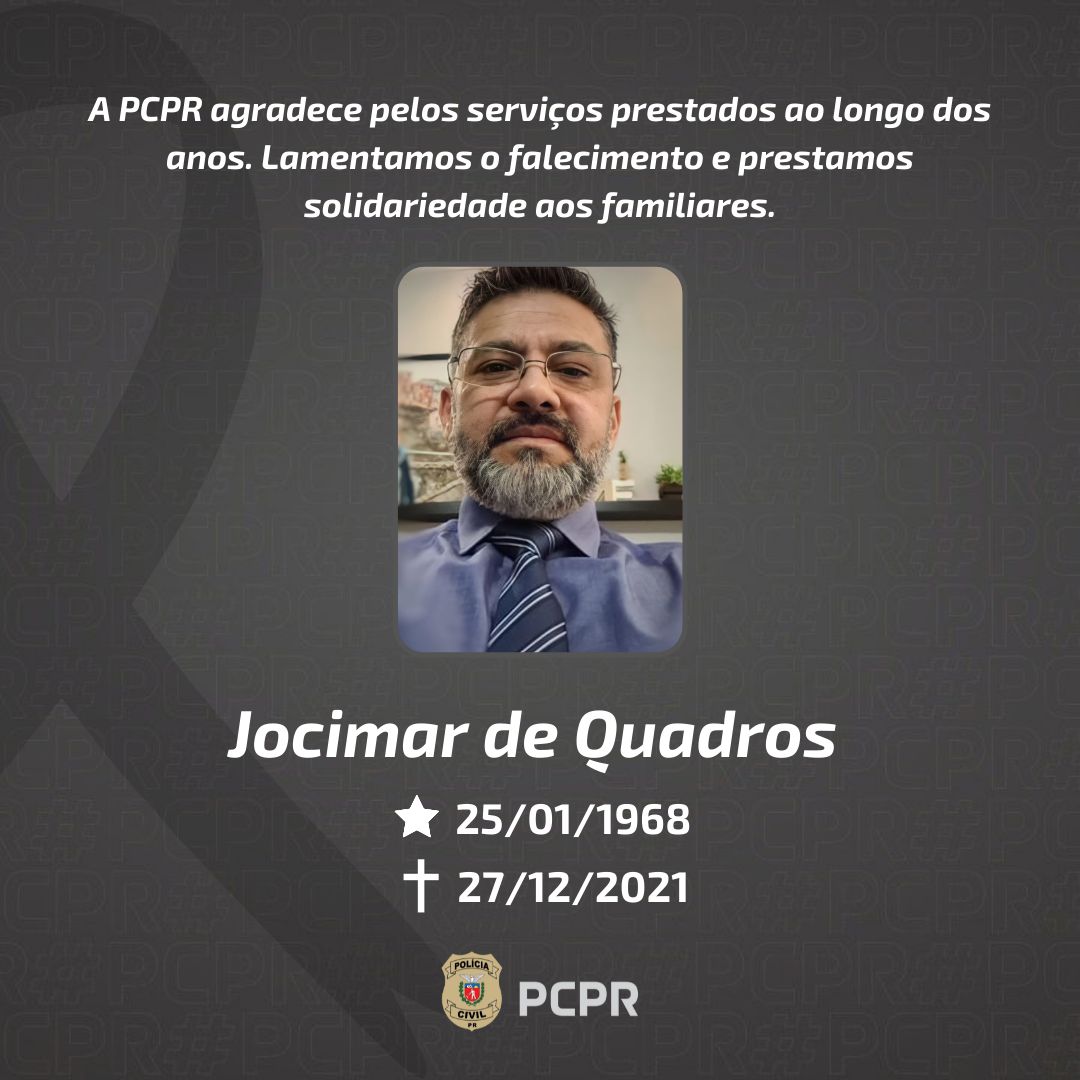 É com pesar que a Polícia Civil do Paraná (PCPR) comunica o falecimento do Sr. Jocimar de Quadros, de 53 anos. Gestor de Segurança da TIM, Quadros foi professor da Escola Superior da PCPR e capacitou inúmeros policiais civis. Sua contribuição para a evolução técnica da PCPR é imensurável.
