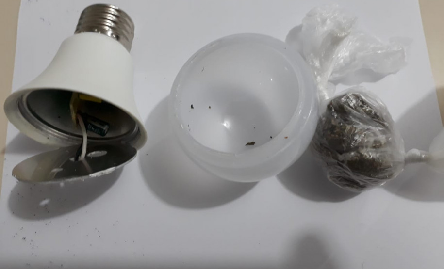 Entre os objetos que seriam entregues ao companheiro da jovem, os policiais que realizavam minuciosamente a revista encontraram seis invólucros de maconha dentro de uma lâmpada de led.