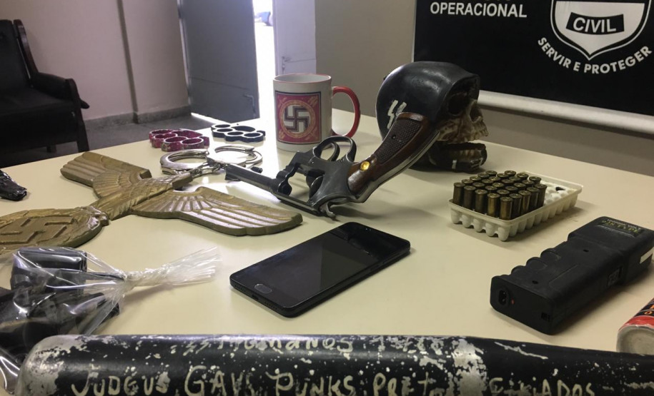 No local, os policiais civis encontraram uma arma de fogo de calibre 38, além de diversos objetos com a cruz suástica e uma caneca com a imagem de Adolf Hitler. De acordo com a PCPR, o jovem fazia publicações sarcásticas e de teor neonazista em suas redes sociais.