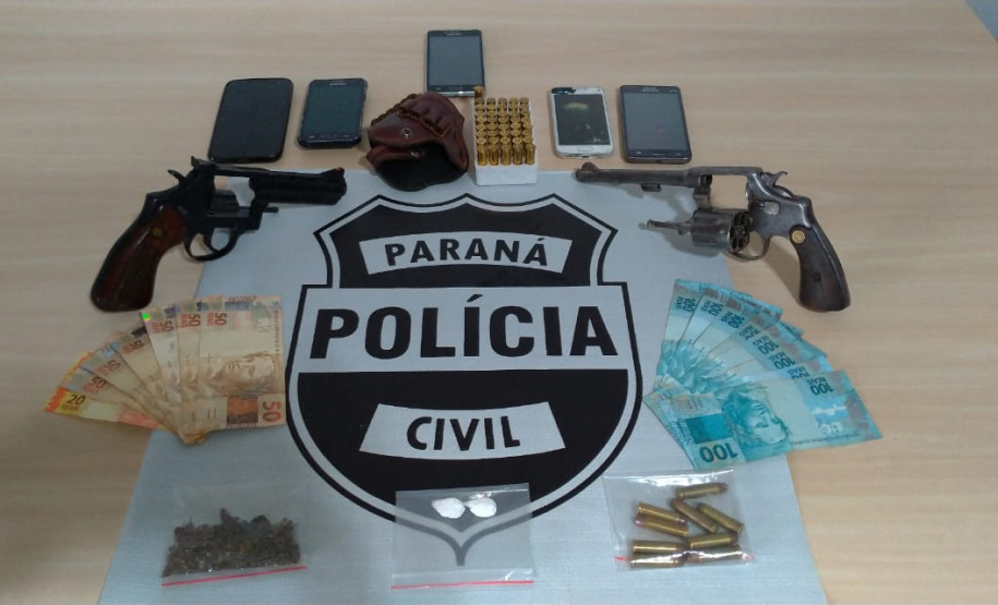 Durante o cumprimento dos mandados, na residência, localizada no bairro Cascavel Velho, foram apreendidos um revolver, calibre 38, 9 (nove) munições do mesmo calibre e algumas porções de drogas, resultando na prisão em flagrante de um homem, de 29 anos, por posse ilegal de arma de fogo e tráfico de drogas. O autuado, que já possui antecedentes criminais por tráfico de drogas.