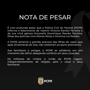22:24 NOTA DE PESAR É com profundo pesar que a Polícia Civil do Paraná (PCPR) informa o falecimento de Yasmin Victoria Rambo Ferreira e de sua irmã gêmea Antonella Dominique Rambo Ferreira, filhas dos policiais civis Afonso Ninja e Veronica Lia Rambo.