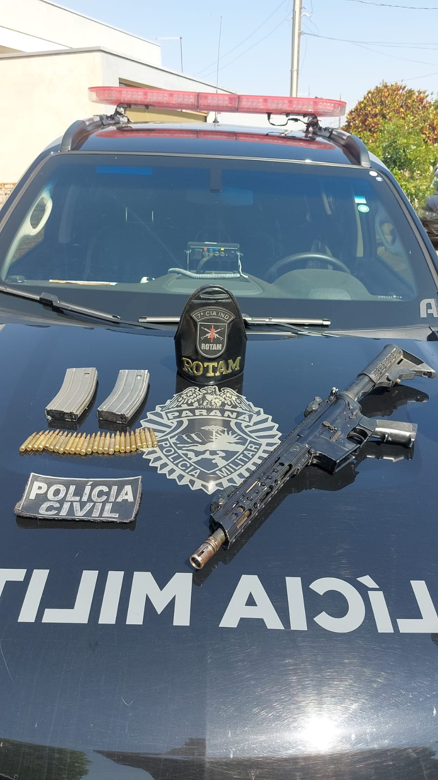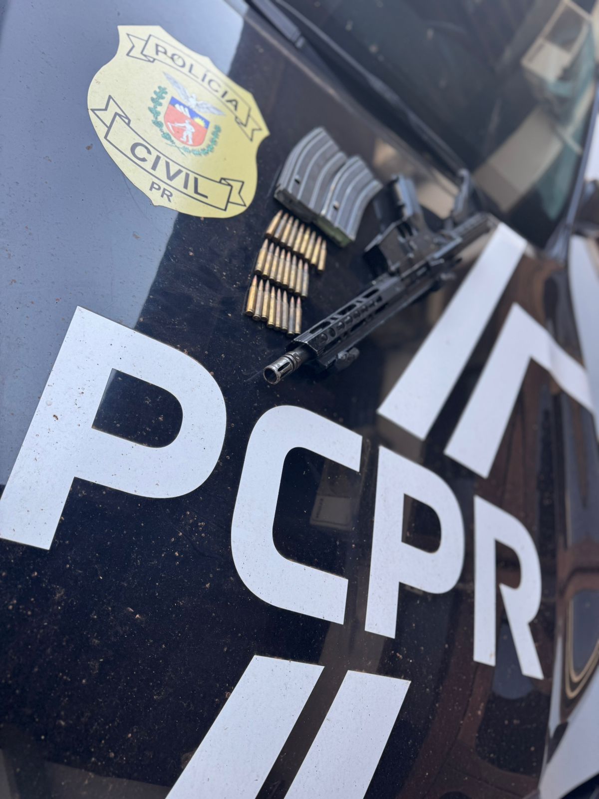 A Polícia Civil do Paraná (PCPR), em ação conjunta com a Polícia Militar do Paraná (PMPR) e a Guarda Municipal de Arapongas, apreendeu um fuzil calibre 5.56, dois carregadores e 25 munições intactas neste sábado (4), em uma residência localizada em Arapongas, Norte do Estado.