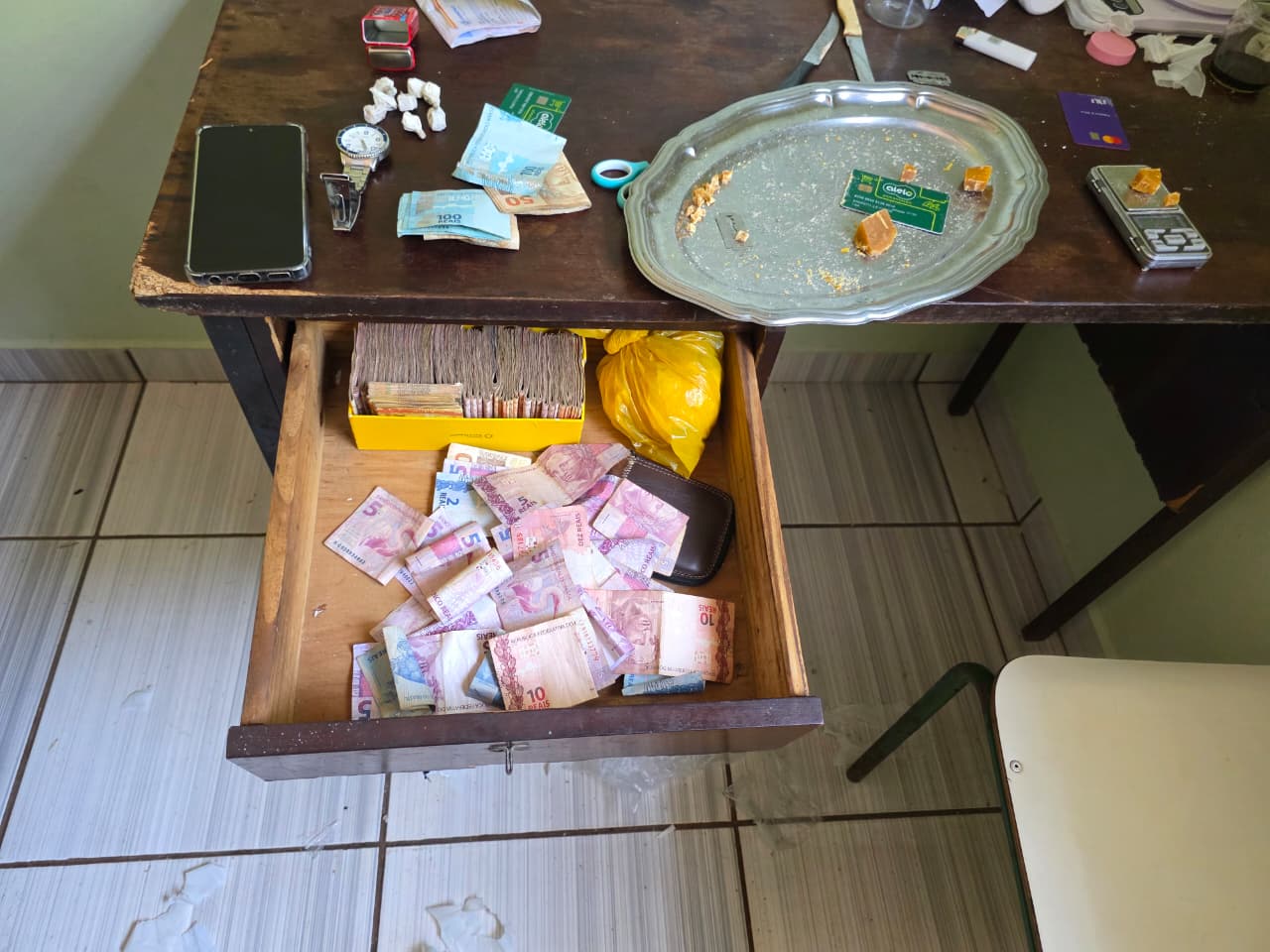 “No imóvel, as equipes apreenderam 148 gramas de crack, 224 gramas de cocaína, embalagens plásticas e dinheiro. Parte da droga já estava embalada e pronta para comercialização”, explica.
