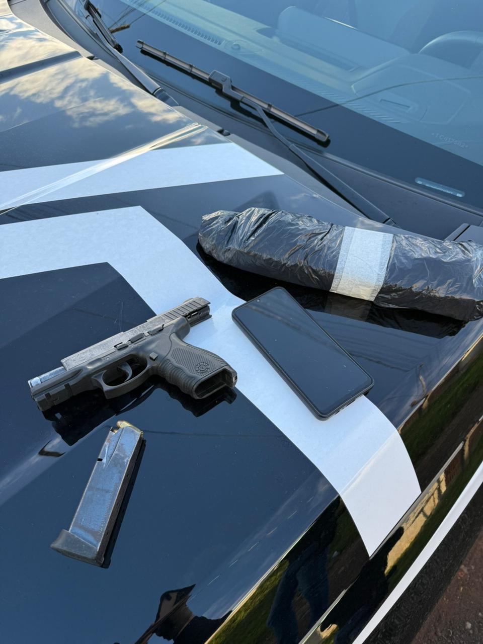 Durante o cumprimento de um mandado de busca e apreensão na residência do investigado, as equipes policiais localizaram uma pistola calibre 40 e um tablete de maconha. Diante dos ilícitos, ele foi autuado em flagrante.