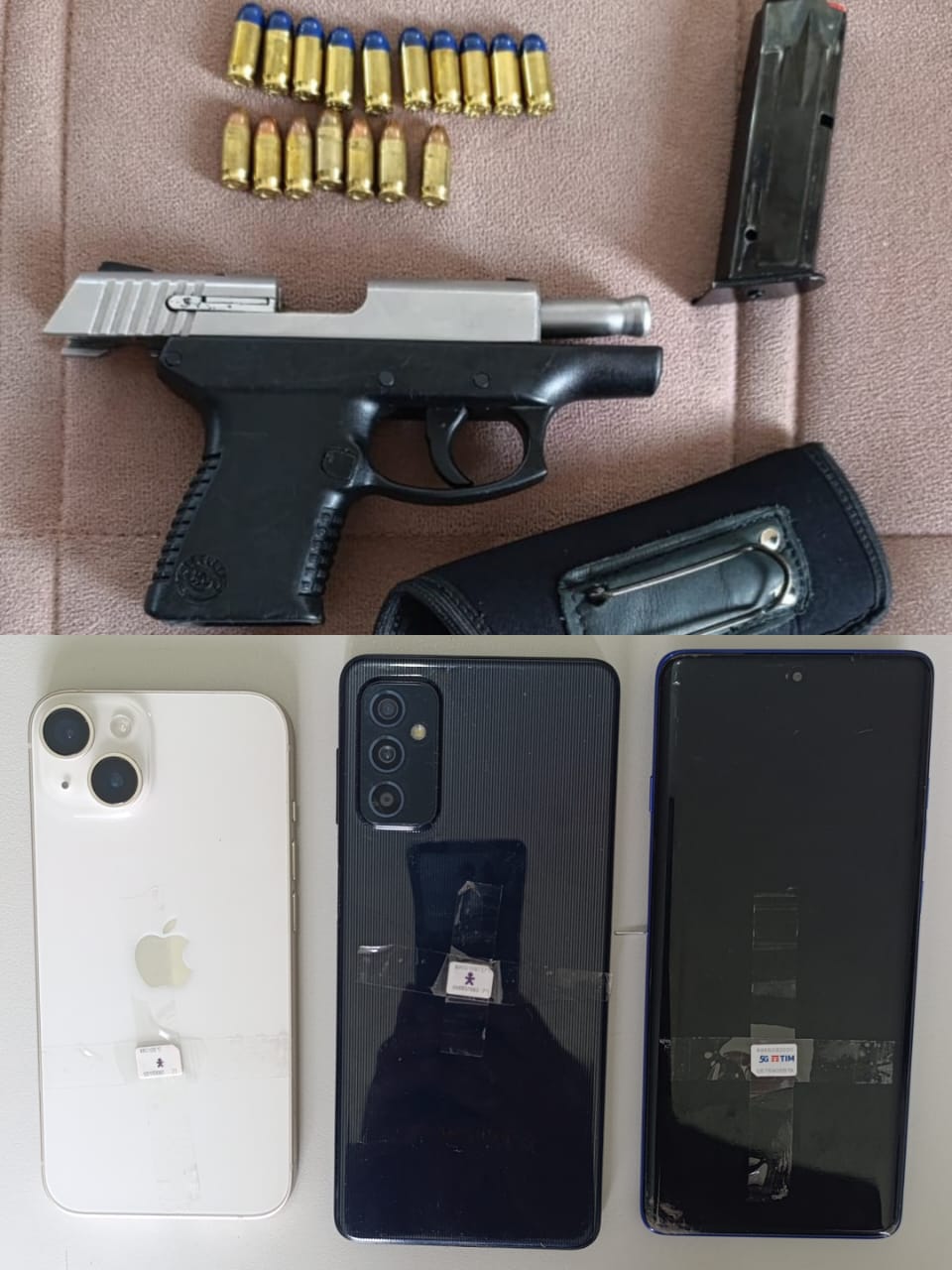 Segundo o delegado da PCPR Willian Arantes Nunes, durante as buscas realizadas na residência do investigado nesta quinta-feira, a equipe policial localizou uma pistola calibre 380, 17 munições intactas e três aparelhos celulares.