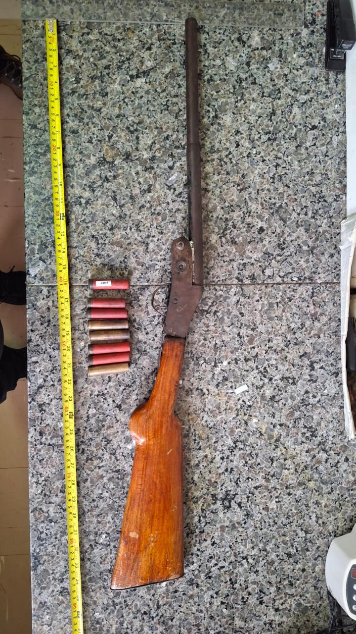 Ao chegar no endereço, os policiais avistaram um veículo citado na denúncia estacionado na via. Em seu interior foi avistada uma espingarda e diversas munições.