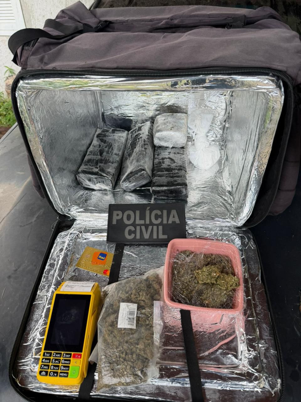 Durante o cumprimento de um dos mandados de busca e apreensão, os policiais localizaram 5,7 quilos de cocaína, 2,5 quilos de maconha e 303 gramas de crack. Também foram apreendidas aproximadamente duas mil unidades de eppendorf utilizadas para embalar cocaína, uma máquina de cartão, duas balanças de precisão e uma caixa de entrega, io que indica estrutura voltada à comercialização das drogas.