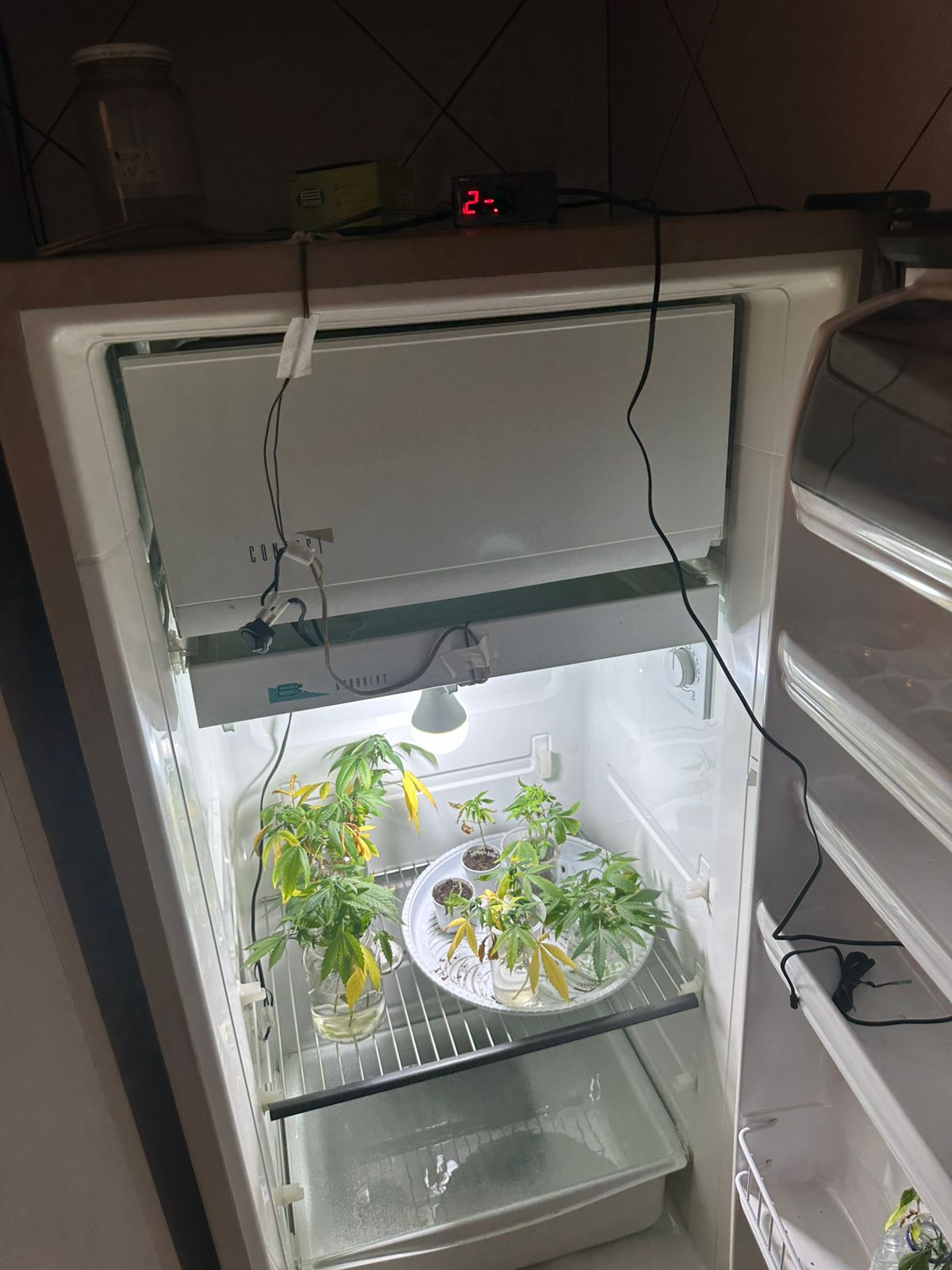 Em uma geladeira, foram encontrados diversos pés de maconha em tamanho pequeno. No andar superior, foi localizada a estufa preparada para o cultivo e vasos com plantas mais desenvolvidas.
