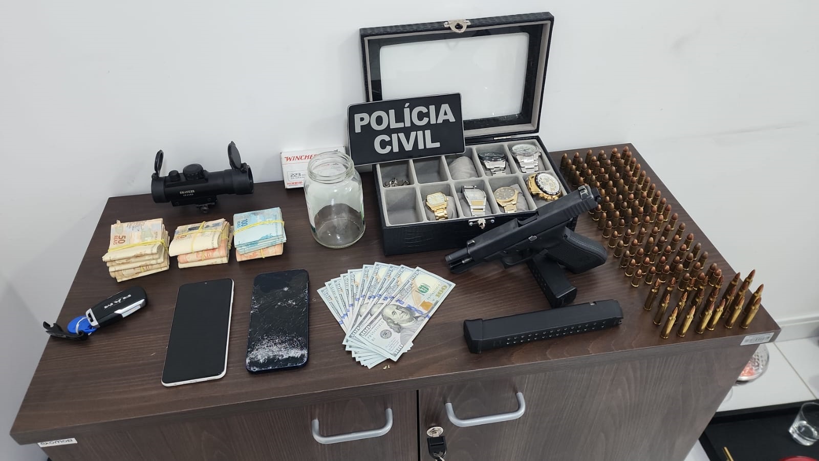Durante as diligências, os policiais localizaram 1.800 porções de cocaína e 350 pedras de crack, R$ 25 mil e US$ 1 mil em espécie, relógios importados, diversos celulares, cem munições de calibre restrito, 20 munições de fuzil, uma pistola de calibre restrito, dois carros e uma motocicleta. Além dos alvos dos mandados de prisão, uma pessoa foi presa em flagrante.