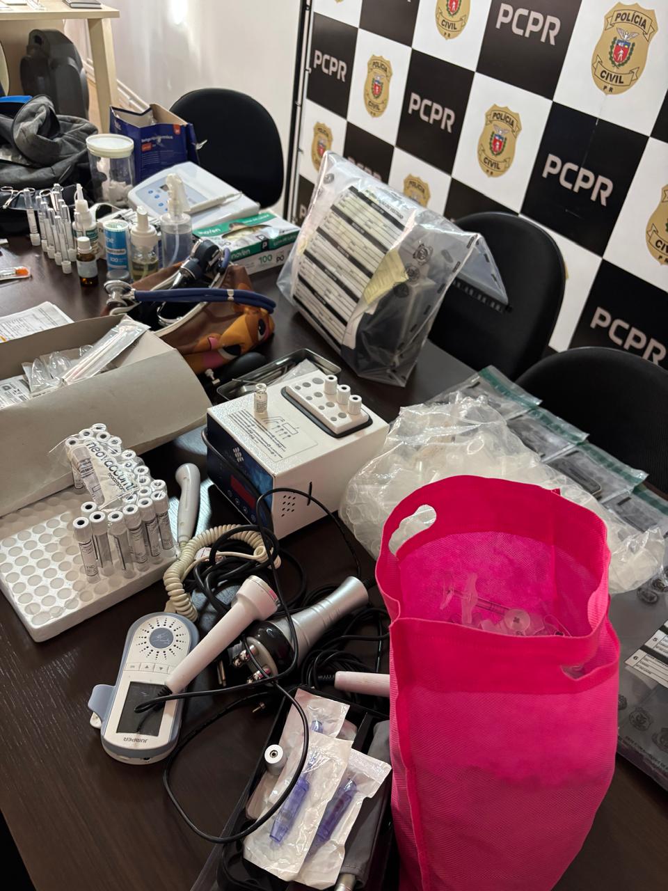 Nesta manhã, a PCPR cumpriu a ordem de prisão e de buscas no endereço do suspeito. No local, foram apreendidos medicamentos sem indicação de procedência e instrumentos voltados para prática do exercício legal da medicina. Além destes, foram localizados diversos itens que possivelmente foram utilizados em procedimentos e que não haviam sido descartados corretamente.