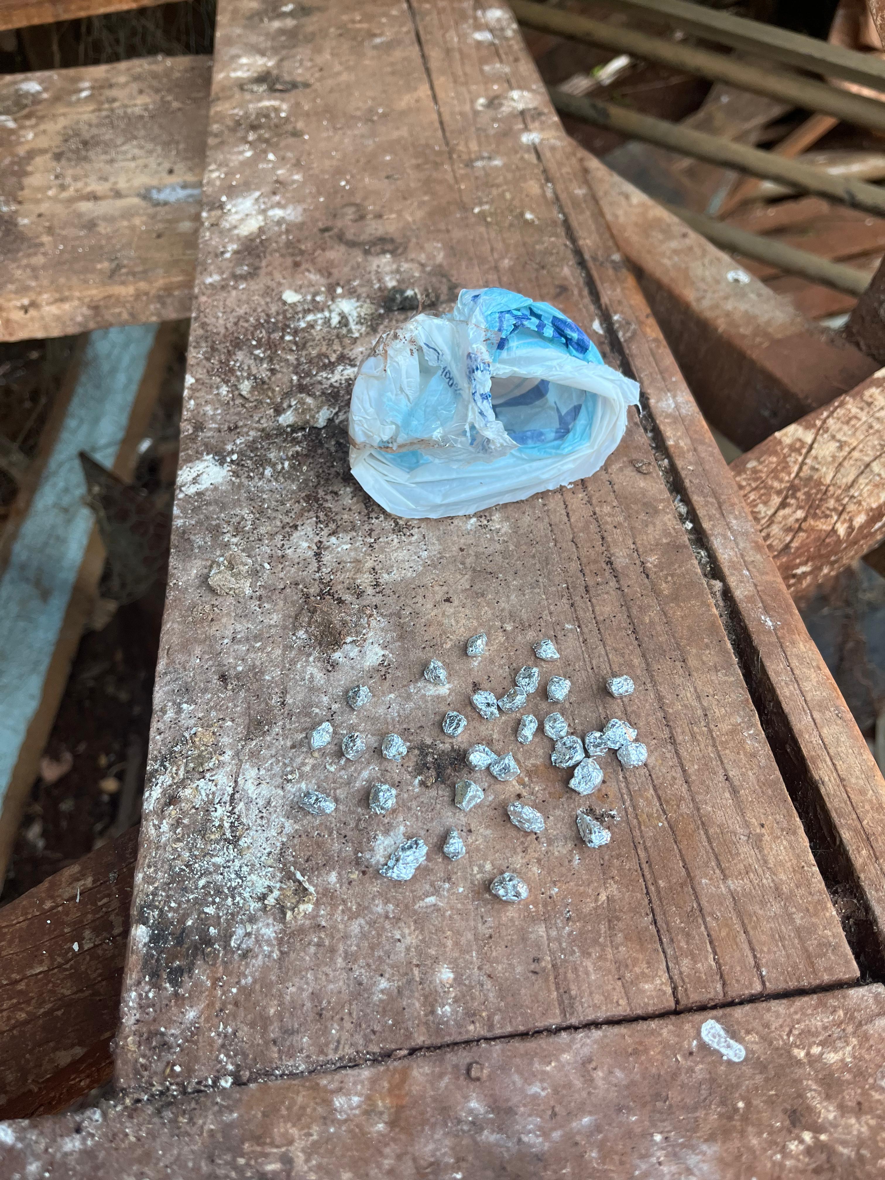Durante as diligências, os policiais localizaram 29 pedras de substância análoga a crack, embaladas individualmente e prontas para comercialização, totalizando 3,7 gramas. O material foi encontrado no telhado de um galinheiro ao lado do quarto do investigado.