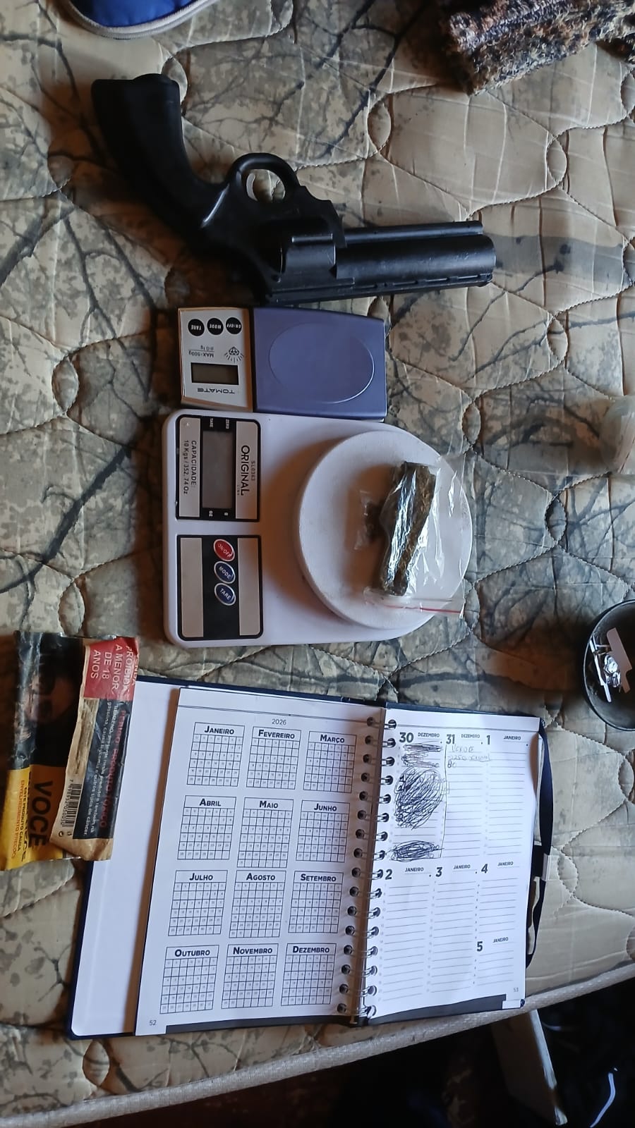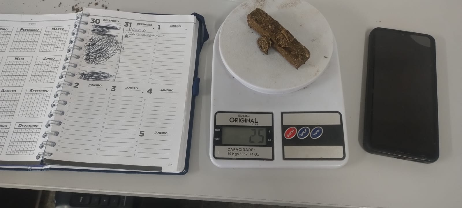 “Durante as buscas, os policiais localizaram aproximadamente 25 gramas de maconha, duas balanças de precisão, um caderno com anotações relacionadas ao tráfico de drogas, embalagens plásticas do tipo ziplock e dois aparelhos celulares”, explica.