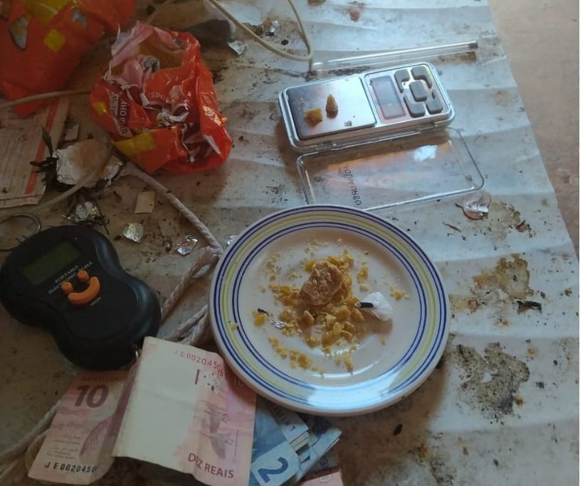 Ao chegar ao endereço alvo, o suspeito foi flagrado na área externa da residência fracionando uma pedra de crack com o auxílio de uma balança de precisão e papel alumínio.