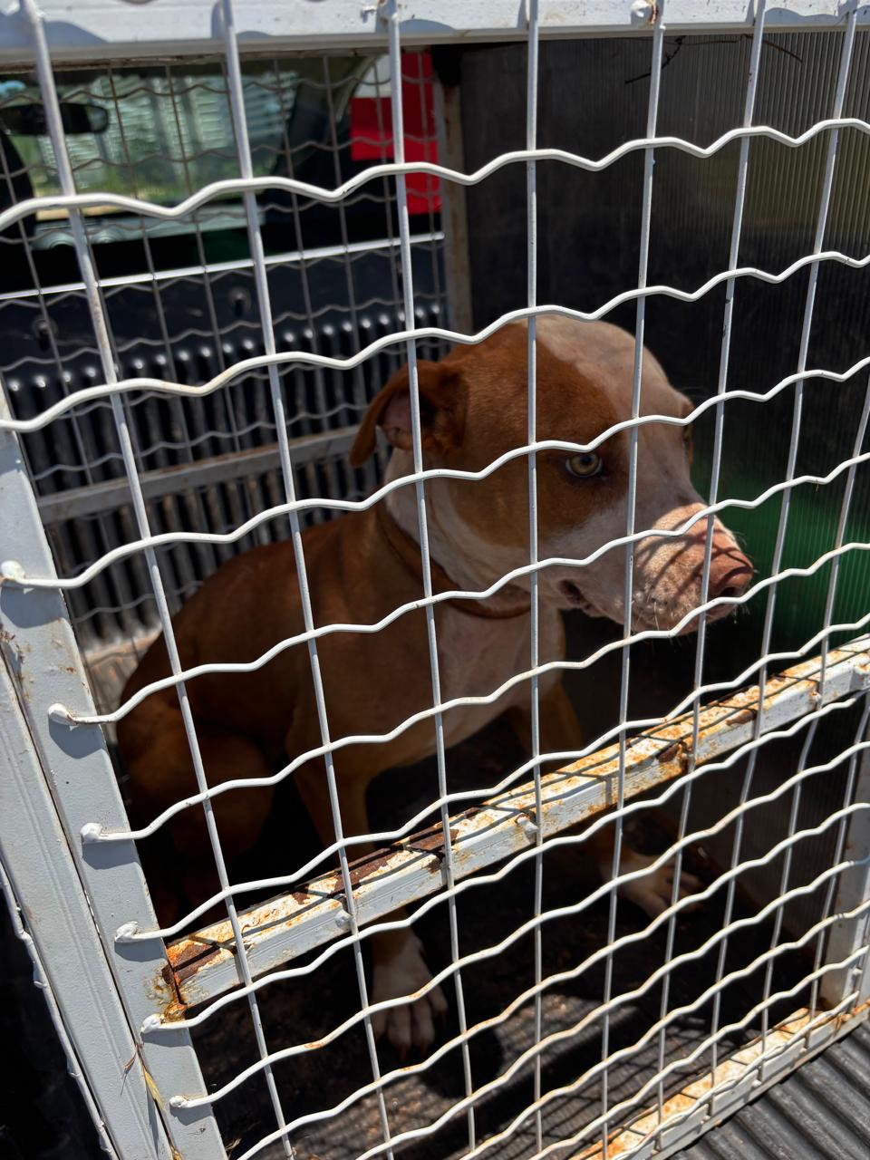 A equipe se deslocou até a residência e ao chegar deparou com um animal da raça pitbull, amarrado, exposto ao sol, sem comida e com um pouco de água suja.