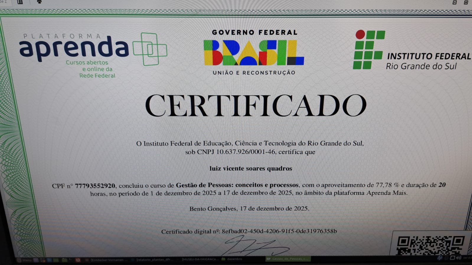 Pelo IFRS, concluiu cursos de gestão de pessoas, conceitos e processos organizacionais e psicologia do trabalho. Também realizou formações complementares em ambientes computacionais, saúde mental no trabalho e segurança cibernética.